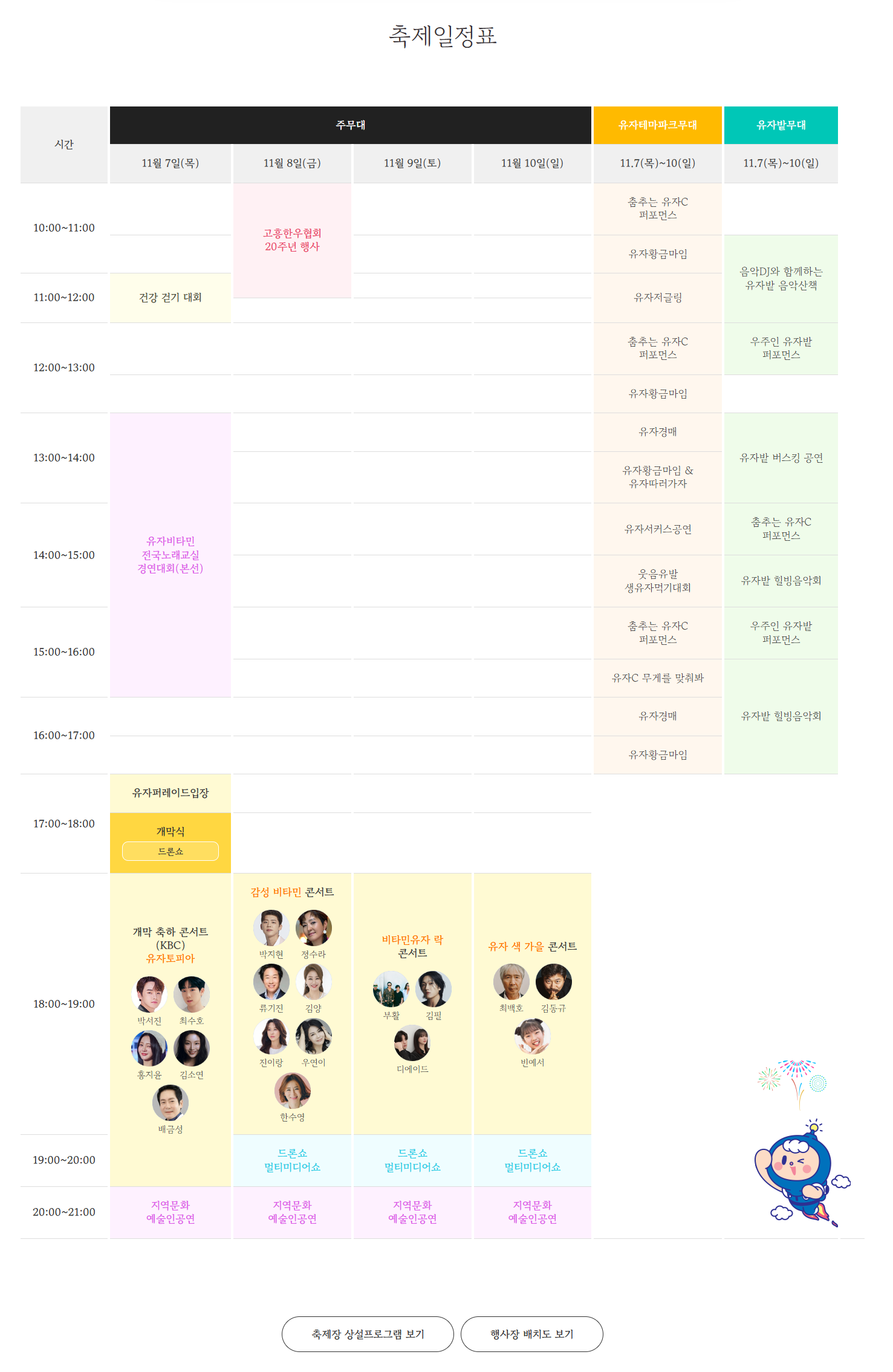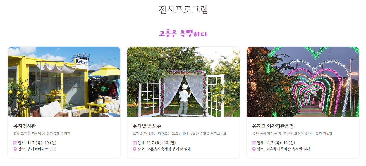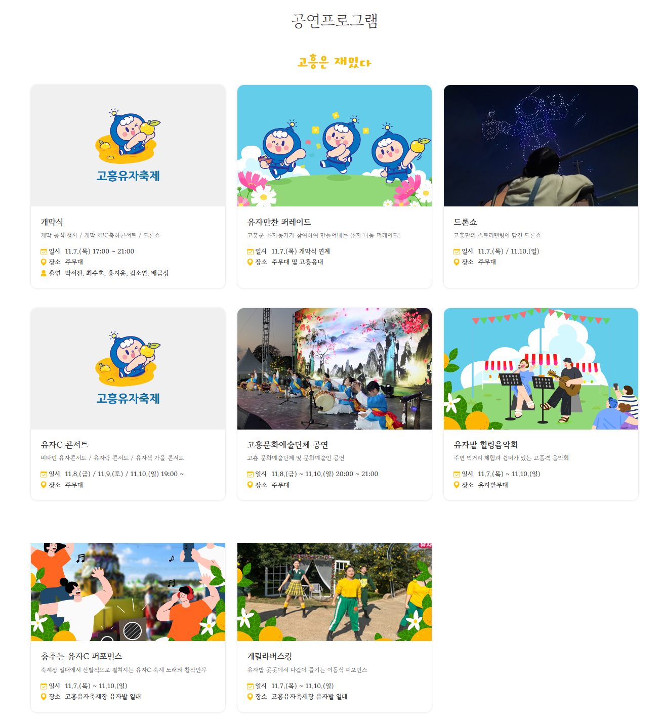 고흥유자축제는 4일 동안 매일 다양한 행사 프로그램을 즐기실 수 있습니다. 행사 일정 미리 체크해서 보고 싶은 공연 꼭 놓치지 마세요.