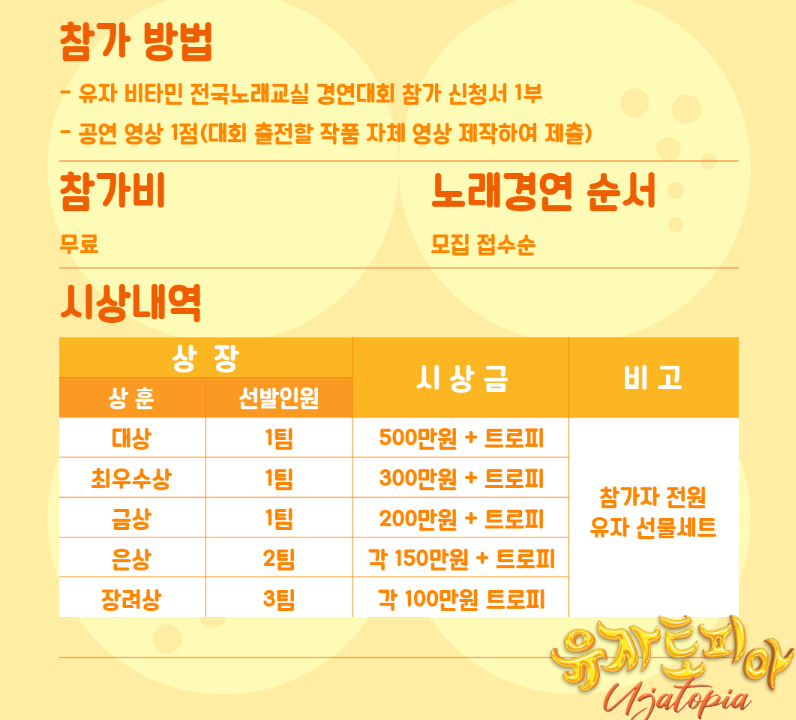 고흥 유자축제 기간 동안 비타민 C 가득한 고흥 유자와 함께하는 다양한 체험 프로그램도 마련되어 있습니다. 유자비타민 전국노래교실 경연대회와 유자밭 막걸리 삼겹살 파티와 같은 흥미로운 프로그램이 준비되어 있으니, 참가신청 후 즐거운 시간을 만끽해 보세요! 노래교실 경연대회는 대상 상금이 무려 500만 원이니 노래에 자신 있는 분들은 꼭 참여하시길 바랍니다.