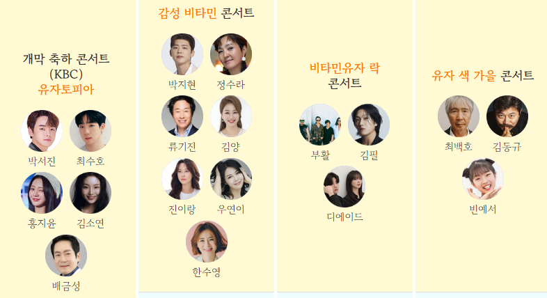 - 행사내용 : 개막 축하 콘서트 유자토피아, 감성 비타민 콘서트, 유자 락 콘서트, 유자향 가을 콘서트 등