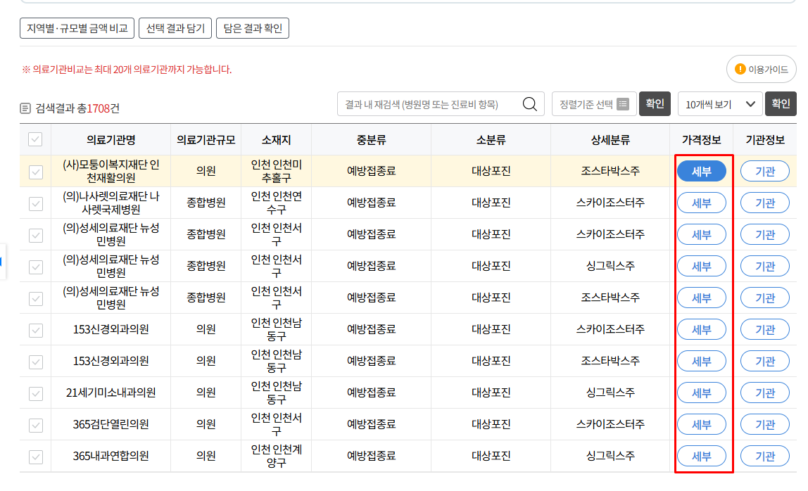 검색결과 중 가격 정보에 있는 '세부'버튼을 누르면 가격을 확인할 수 있습니다.
