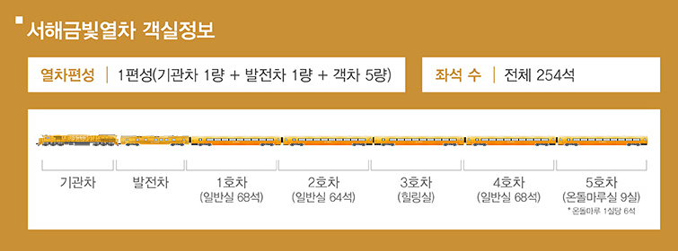 서해금빛열차에는 다섯 종류의 객실이 있습니다. 각 객실마다 분위기가 달라서 각자의 필요와 선호에 따라 객실을 선택합니다. (총 좌석 수 254석)