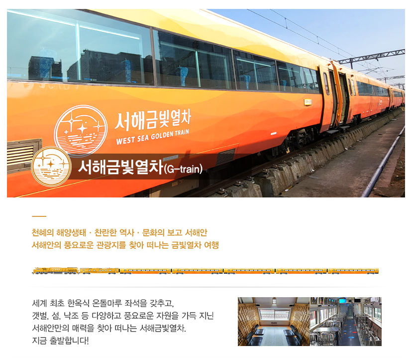 서해금빛열차는 충청남도 서해안을 따라서 운행되는 한국철도공사의 관광열차로 세계 최초로 한옥식 온돌마루 좌석을 제공합니다. 여행 중 힐링을 할 수 있응 공간과 다양한 편의 시설까지 갖추고 있어서 인기가 많습니다. 용산역에서 출발해 익산까지 이어지며 소요시간은 약 3시간 7분입니다.