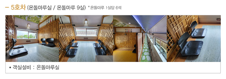 온돌마루실 : 따뜻한 온돌 바닥을 느끼며 편하게 이동할 수 있는 객실입니다. 5호차에 위치하고 있으며 9개 객실이 있습니다. 3인에서 6일까지 이용할 수 있습니다.