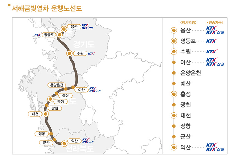 서해금빛열차는 서울 용산역을 출발하여 장항선을 따라 아산, 예산, 홍성, 대천, 장항, 군산, 익산 등 서해안의 주요 도시를 경유합니다. 이 열차는 각 정차역에서 다양한 관광 프로그램과 연계되어 여행객들에게 재밌는 경험도 하게 해줍니다.
