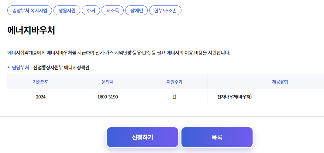 국민 기초생활 보장법에 따른 생계 의료 주거급여 수급 가구에 해당되는 분들은 에너지 바우처 신청 대상에 들어갑니다.