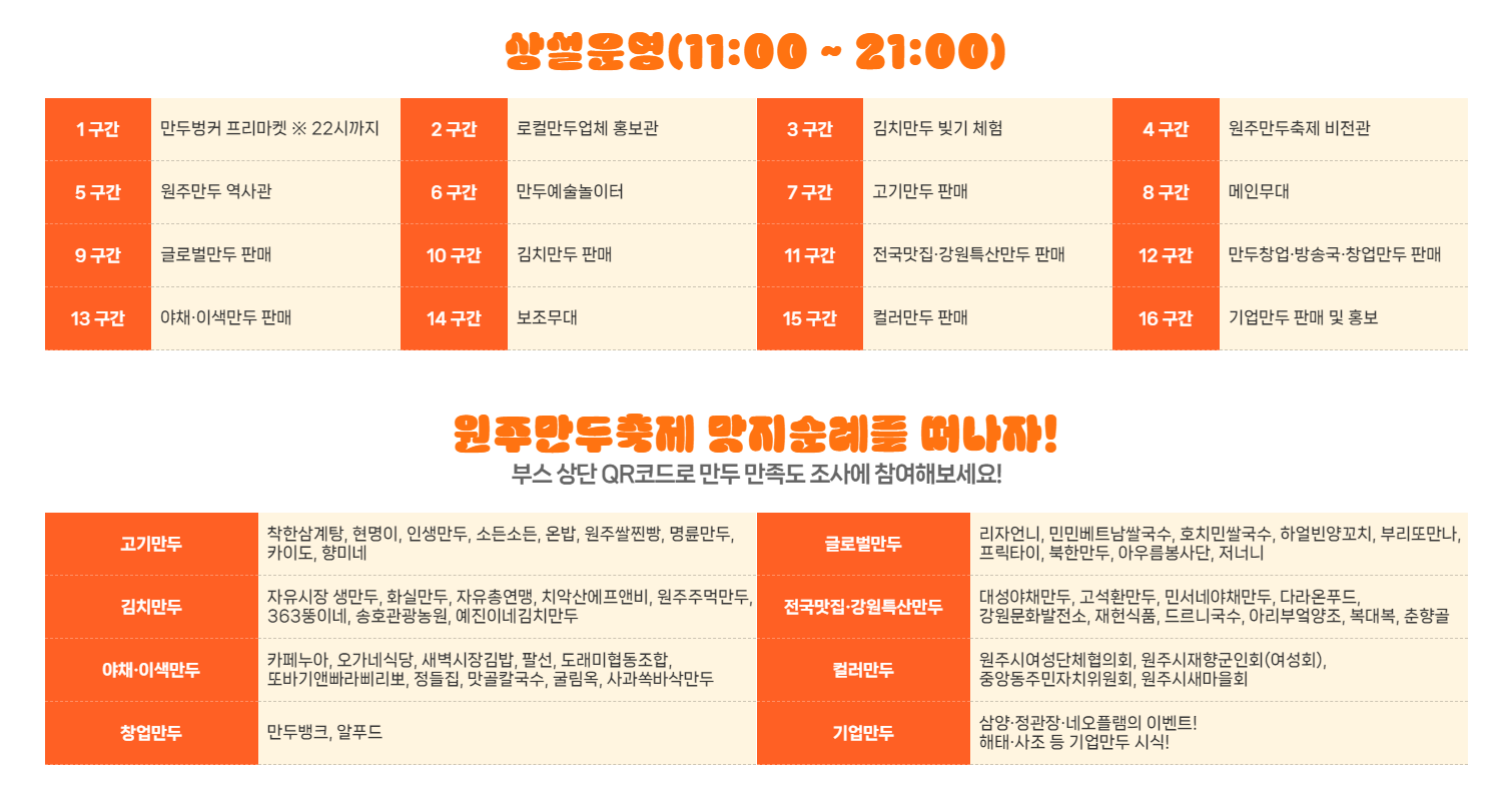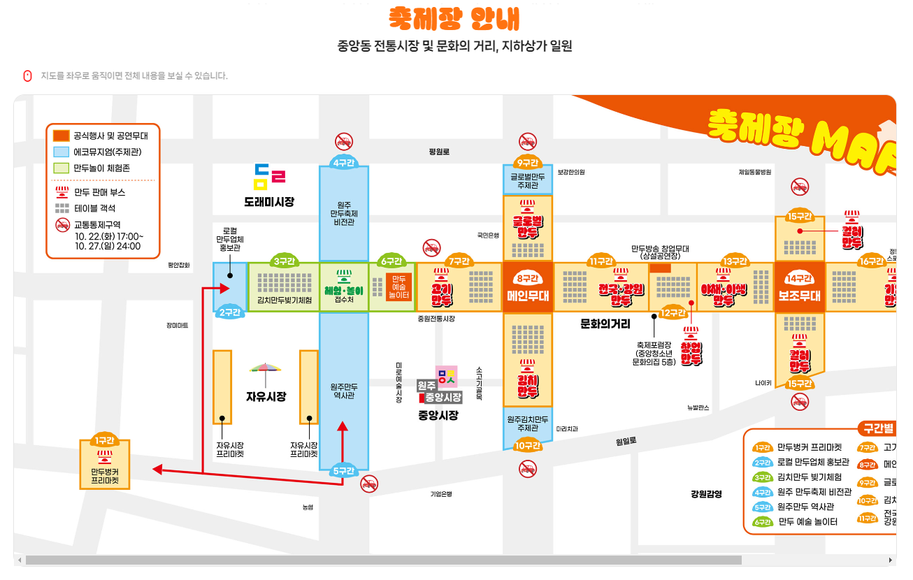 ※ 원주 만두축제 행사장 안내도에서 시설 위치, 체험, 만두 판매 부스를 미리 확인 후 방문하면 더 즐겁게 축제를 즐길 수 있습니다.