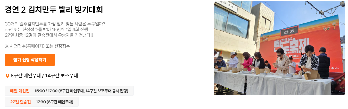 30개의 원주 김치만두를 가장 빨리 먹는 사람을 찾습니다. 사전 또는 현장접수를 받아 16명씩 1일 4회 진행하며 27일 최종 12명이 결승전에 올라 우승자를 가려냅니다.