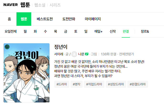 드라마 <정년이>는 네이버 웹툰의 동명의 웹툰을 원작으로 만들어졌습니다. 2019년 4월부터 시작해 2022년 5월 최종완결된 웹툰으로 여성국극을 소재로 다룬 작품입니다. 깔끔하면서도 탄탄한 기초가 돋보이는 그림체라서 드라마가 궁금하신 분들은 먼저 웹툰 원작을 찾아보는 것도 좋습니다.
