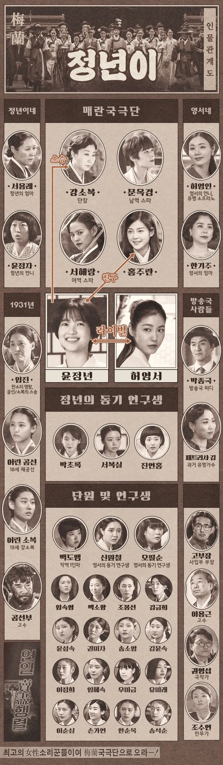 카리스마 있고 대쪽 같은 성격을 가진 인물로 10년 전 모두의 비웃음을 뒤로하고 여성 국악인을 모아 매란국극단을 만들었다. 고지식하지만 단원들의 든든한 버팀목이 되어 주고 있다.