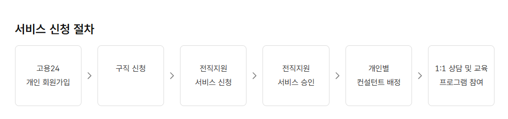 취업활동계획 수립 → 구직서류(이력서 및 자기소개서) 코칭 → 구직전략 수립 → 면접전략 → 구직알선 → 취업 → 사후관리