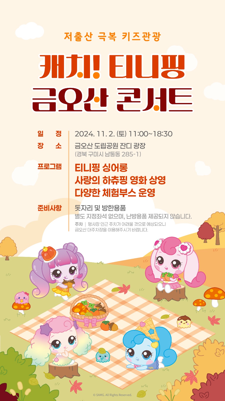 - 11월 2일(토), 금오산 도립공원 잔디광장에서 열리는 캐치! 티니핑 금오산 콘서트로 오세요.