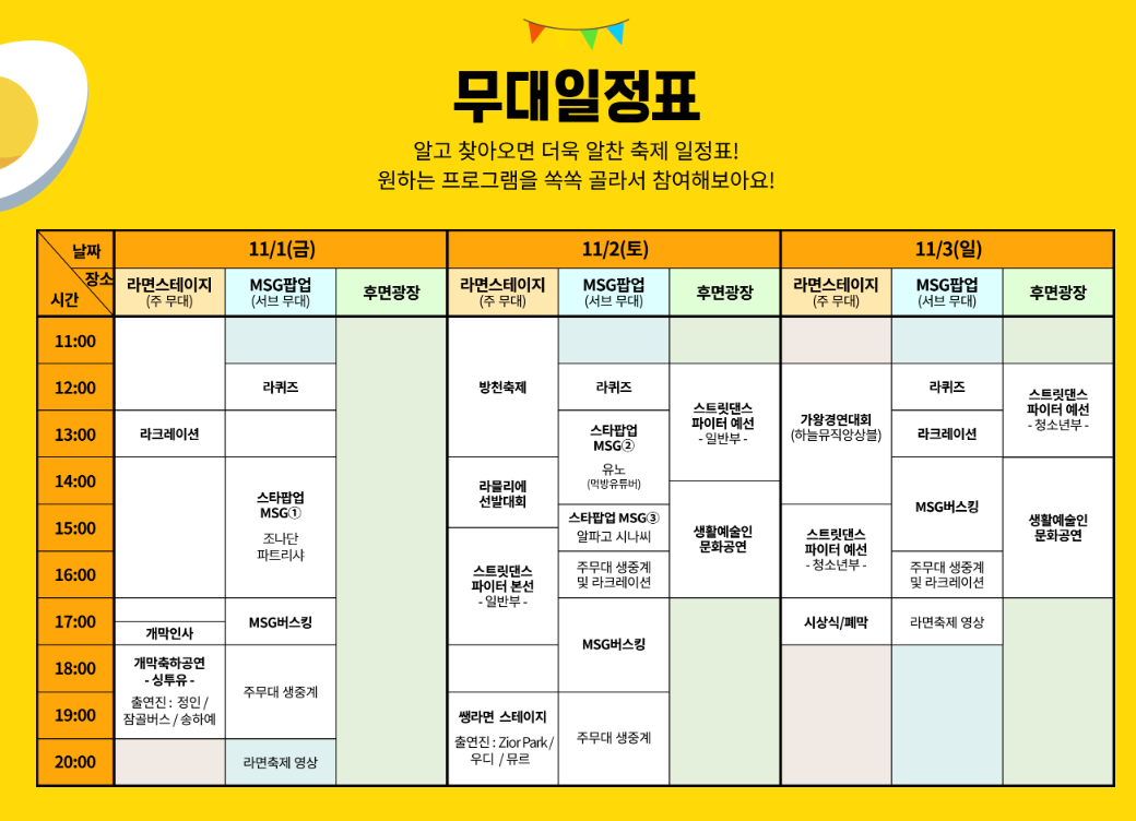 구미 라면축제를 찾는 분들을 위해 다양한 초대 가수와 연예인들이 축하 무대를 꾸밀 예정입니다. 라인업을 확인해 보세요.