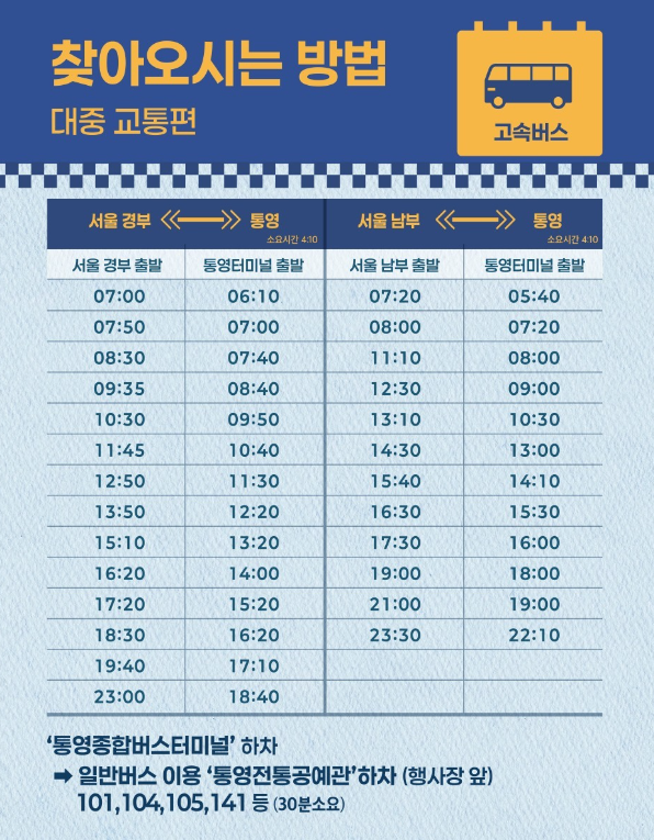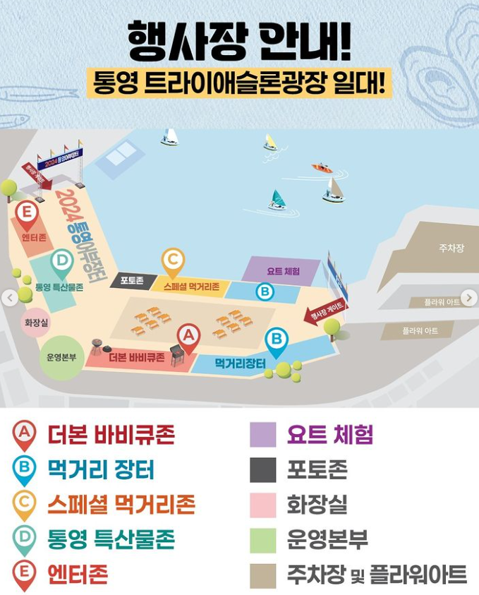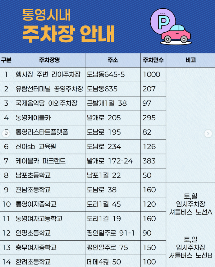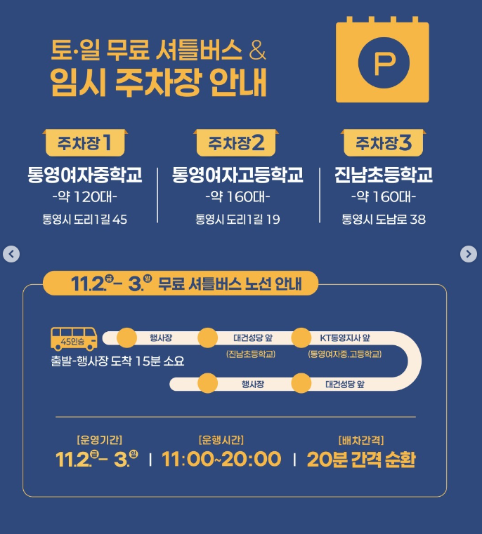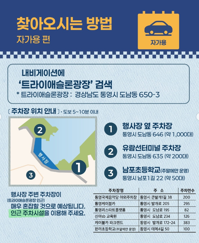 - 행사장 옆 주차장: 통영시 도남동 646 ( 약 1,000대 주차 가능 )