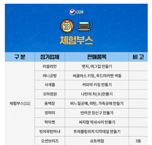 | 먹거리 부스 | 굴과 멍게, 멸치 등 다양한 통영의 대표 해산물로 만든 요리들을 저렴한 가격에 즐길 수 있는 부스 운영 |